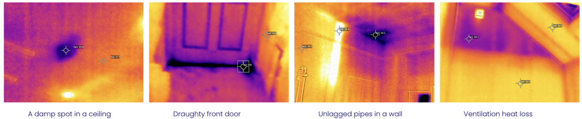 An infrared survey can identify a range of different types of heat loss situations, including draughts, missing insulation, damp spots, etc. Some of these issues can be rectified easily, for example by installing draught excluders, but others might need more specialist follow-up diagnosis.