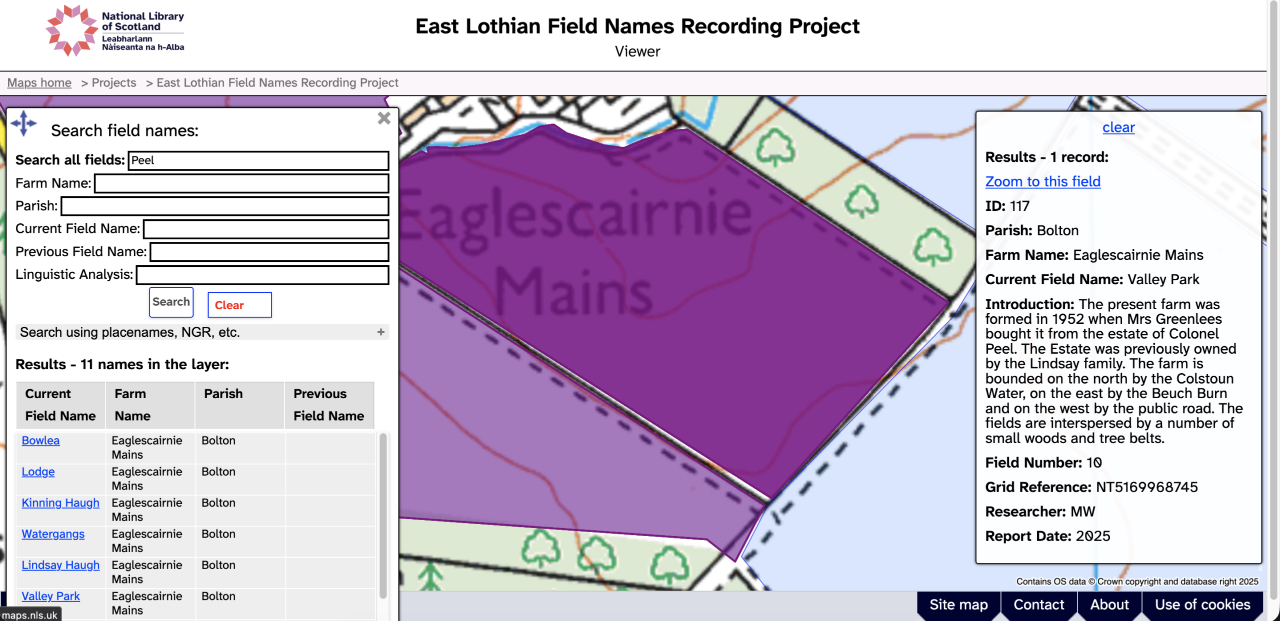 When the field names project was started, you could only search modern place names. Following a discussion with Chris Fleet, we decided to augment the tools. First the ability to search all the database fields was added (and specifically field name, farm name, parish and the long text field). And as of today that place name functionality has been expanded to include a National Grid Reference NGR and also the OS six inch 1885-1913 names. The example below shows the free field search in action.