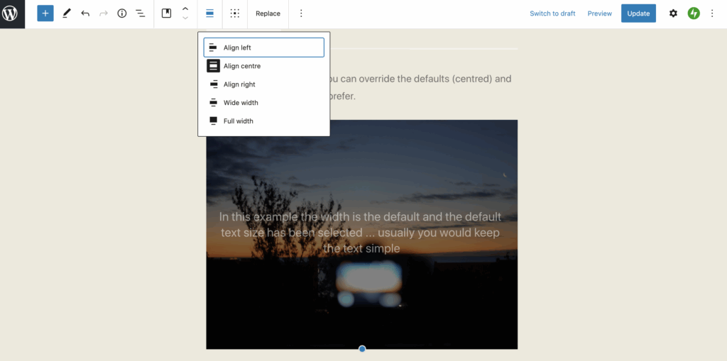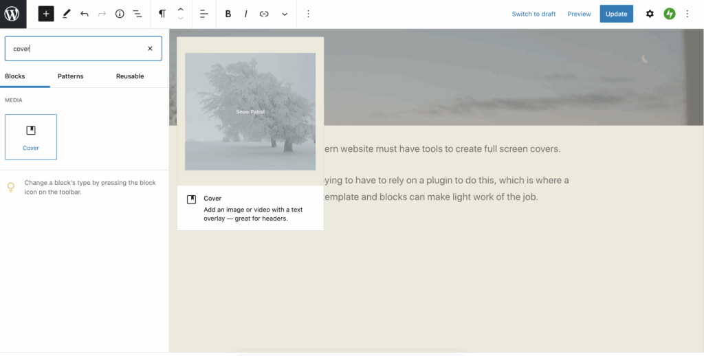 To get started click the Blue Button in th new editor and start typing “co …” and then select Cover from the filtered list. (You will need to ensure you have the Block Editor enabled: You can enable blocks globally or selectively in Dashboard > Writing where you’ll find 2 options. Best to selectively allow users to switch.)