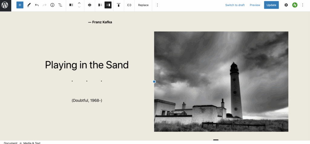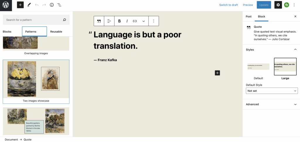 Then there are a panoply of “Pattern” suggestions to layout your page, which to my mind are decidedly retro (and therefore rather fashionable, like dried flowers). However if you like the idea of content overlapping and breaking the rigidity of the traditional website grid, then you’ll enjoy TTO. To see all the available Patterns, click the big blue + sign in the top left or when you first insert a block with the mini black +, select Browse All.