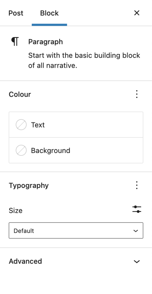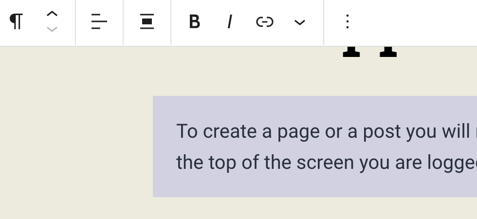 Some config options are in the block tab, in the right hand panel. The paragraph block has only a few simple settings. Others are more complex. Additional block management options – centering, linking and common formatting appear in a locked panel above the content or sometimes floating next to the block – we like it locked (see below):