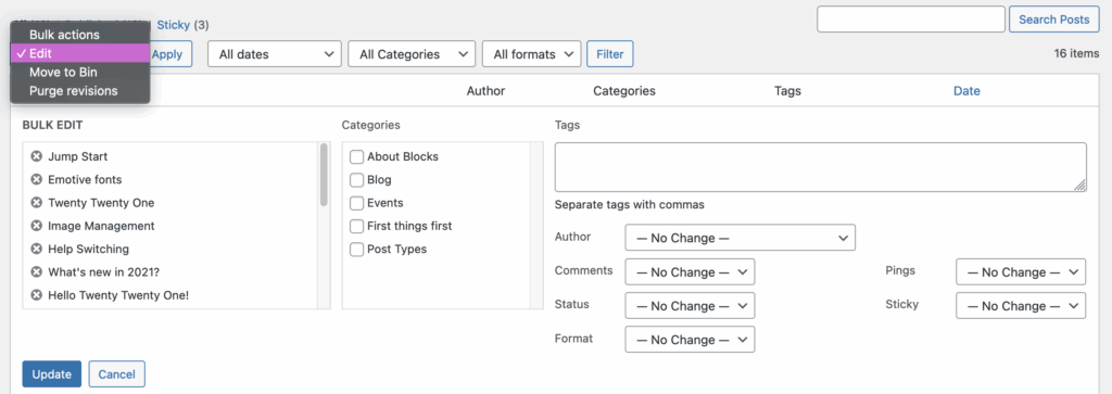 Bulk editing comes into its own when you have a large number of articles or pages to reassign somae attribute or another – e.g. change the author, recategorise everything, or make the content private.