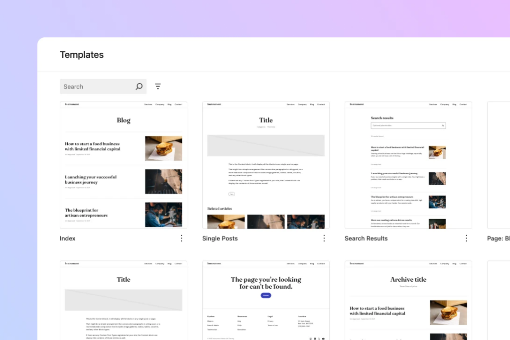 Twentig One allows you to customize every template and template part of your website to fit your needs. Seamlessly use the WordPress block editor to tweak the design and layout of your site. Edit your header, footer, blog, single posts, pages, search results, and 404 page — all within the same interface.