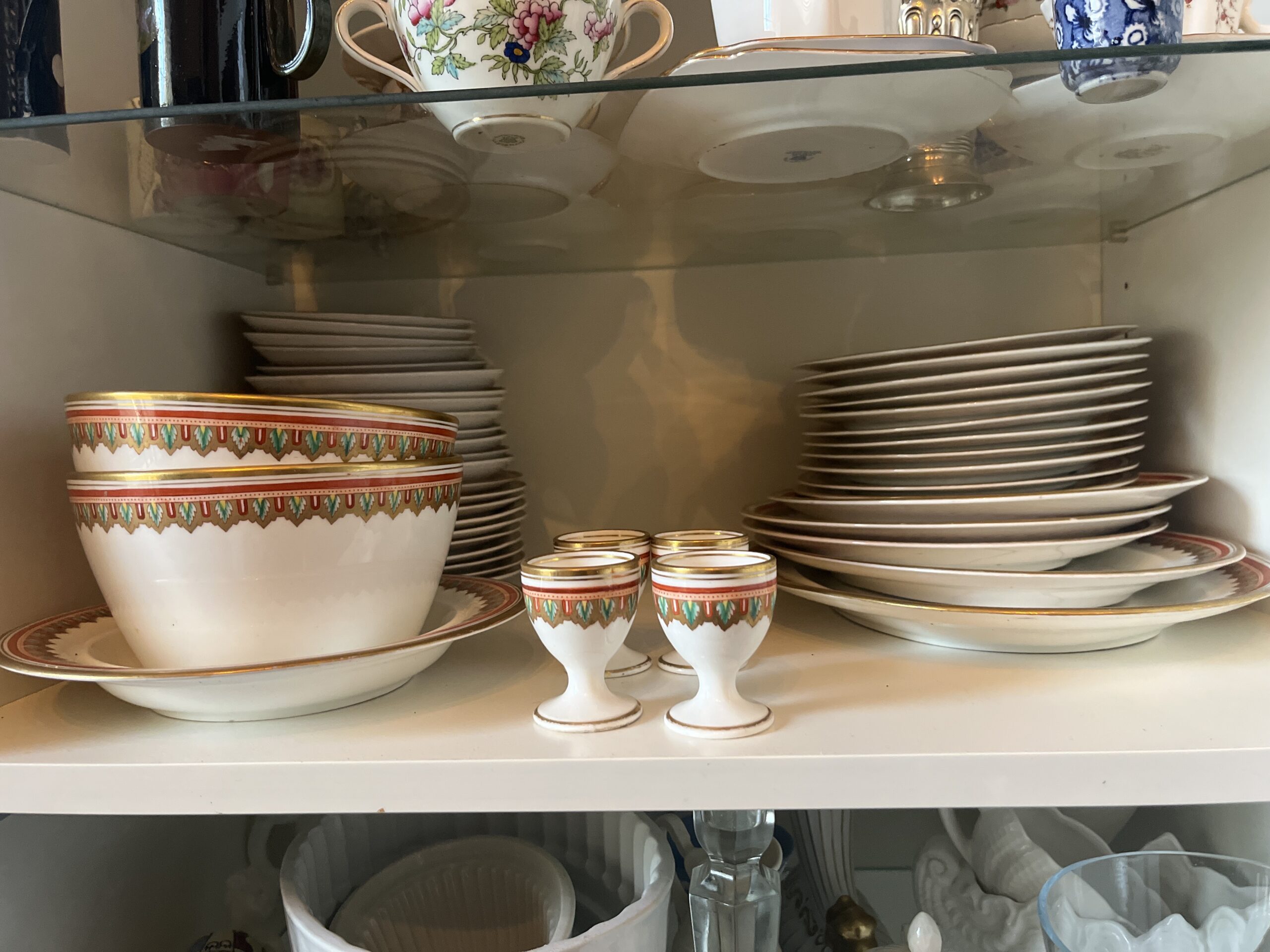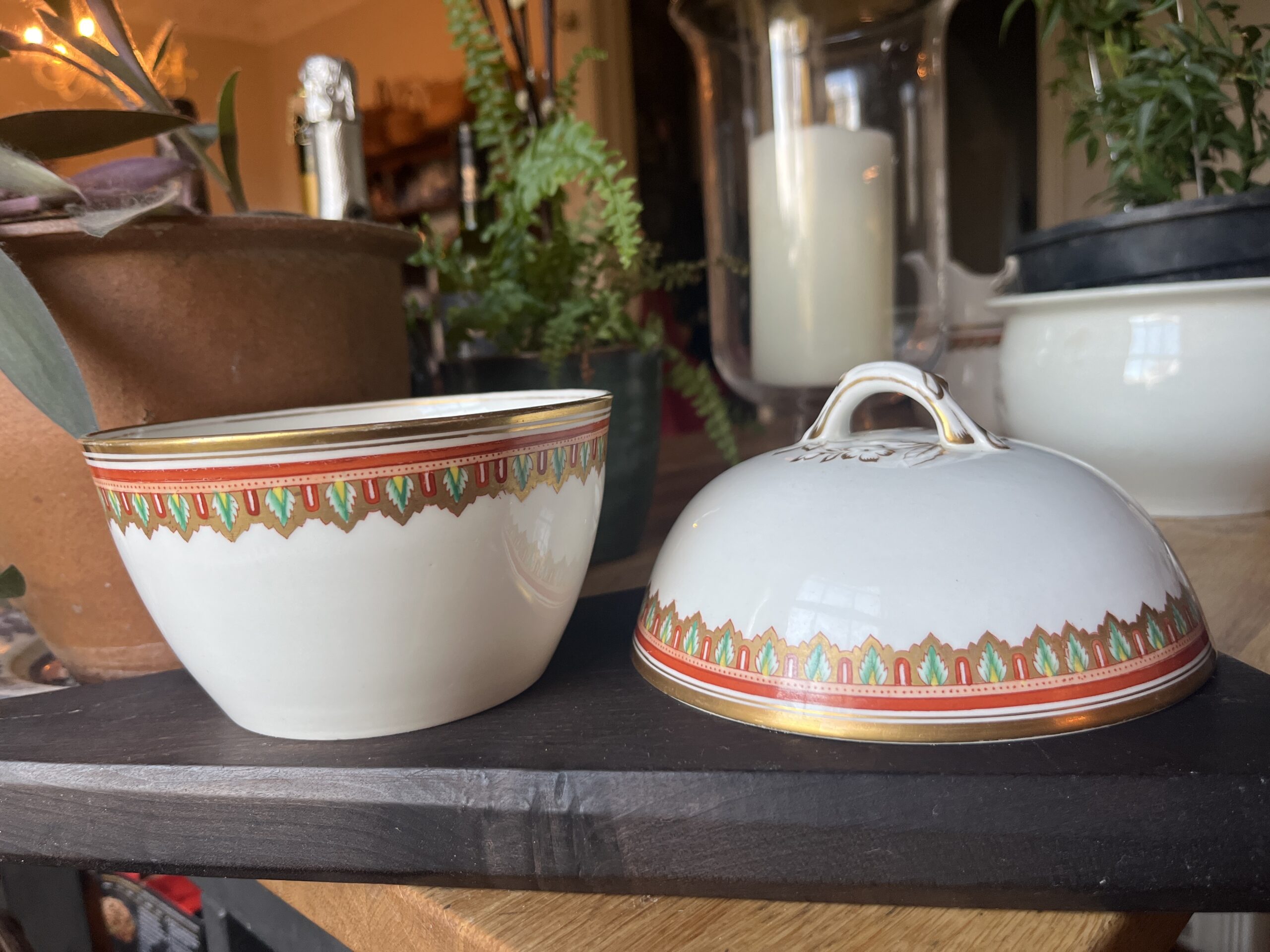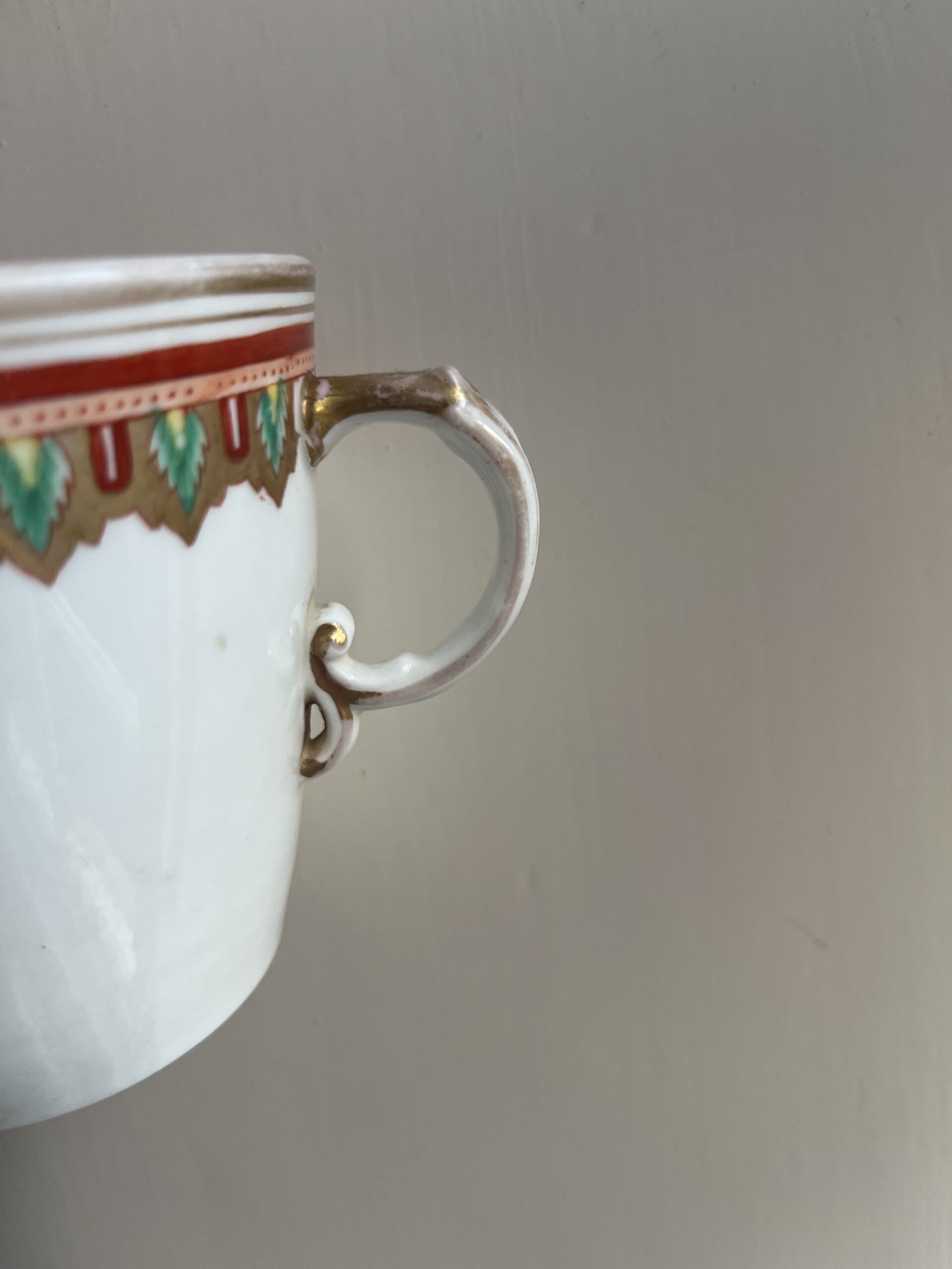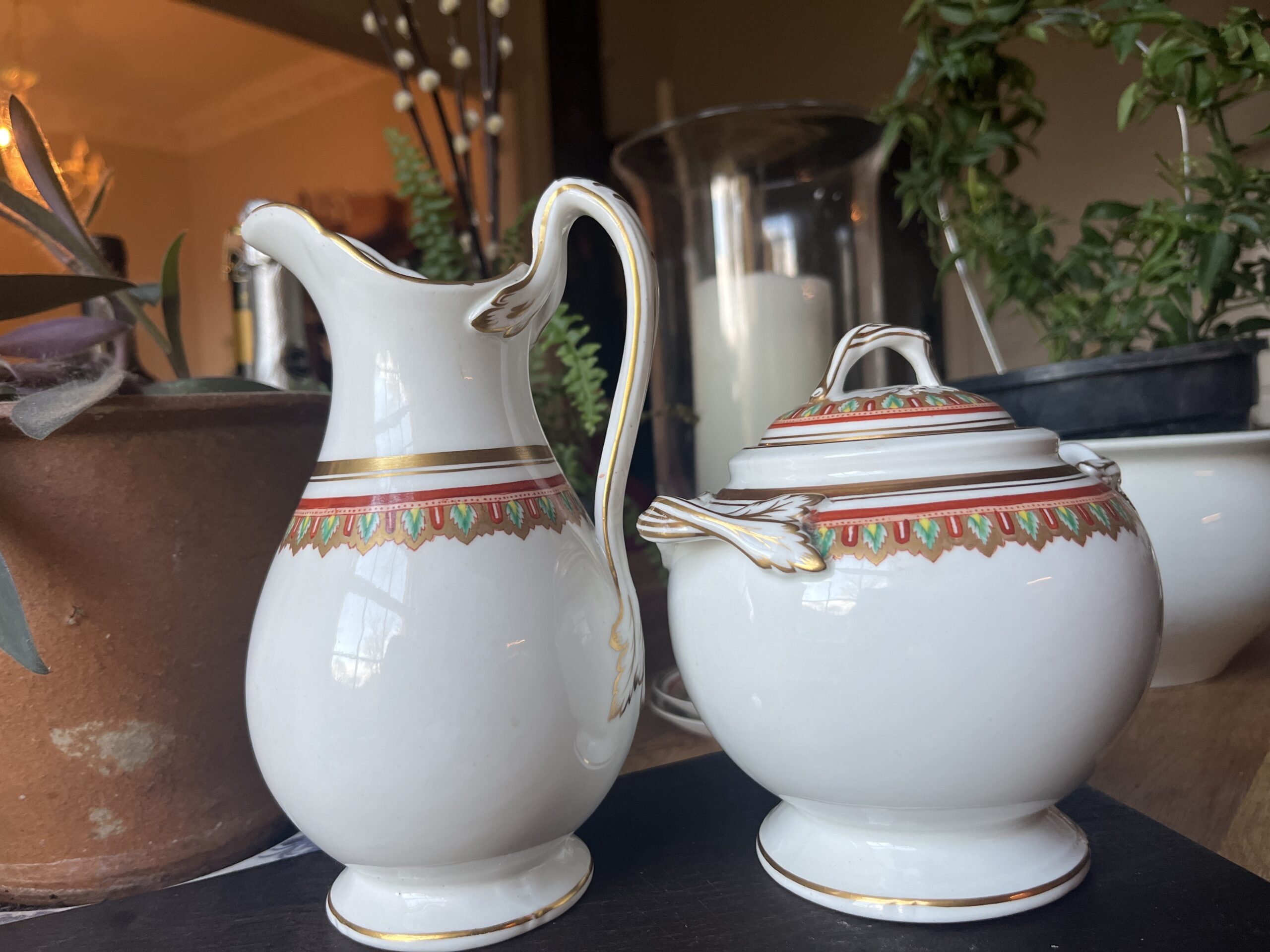 This one began with a breakfast set. Or rather, a partial breakfast set. A handful of cups, rather a lot of plates and saucers, a jug, a sugar bowl, egg cups, a couple of covered dishes. White porcelain, confident shapes, and a bold border: iron red, turquoise-green leaves, and thick gilding. It looked Victorian. It looked serious. It also looked like something that might send you down the wrong path if you weren’t careful.