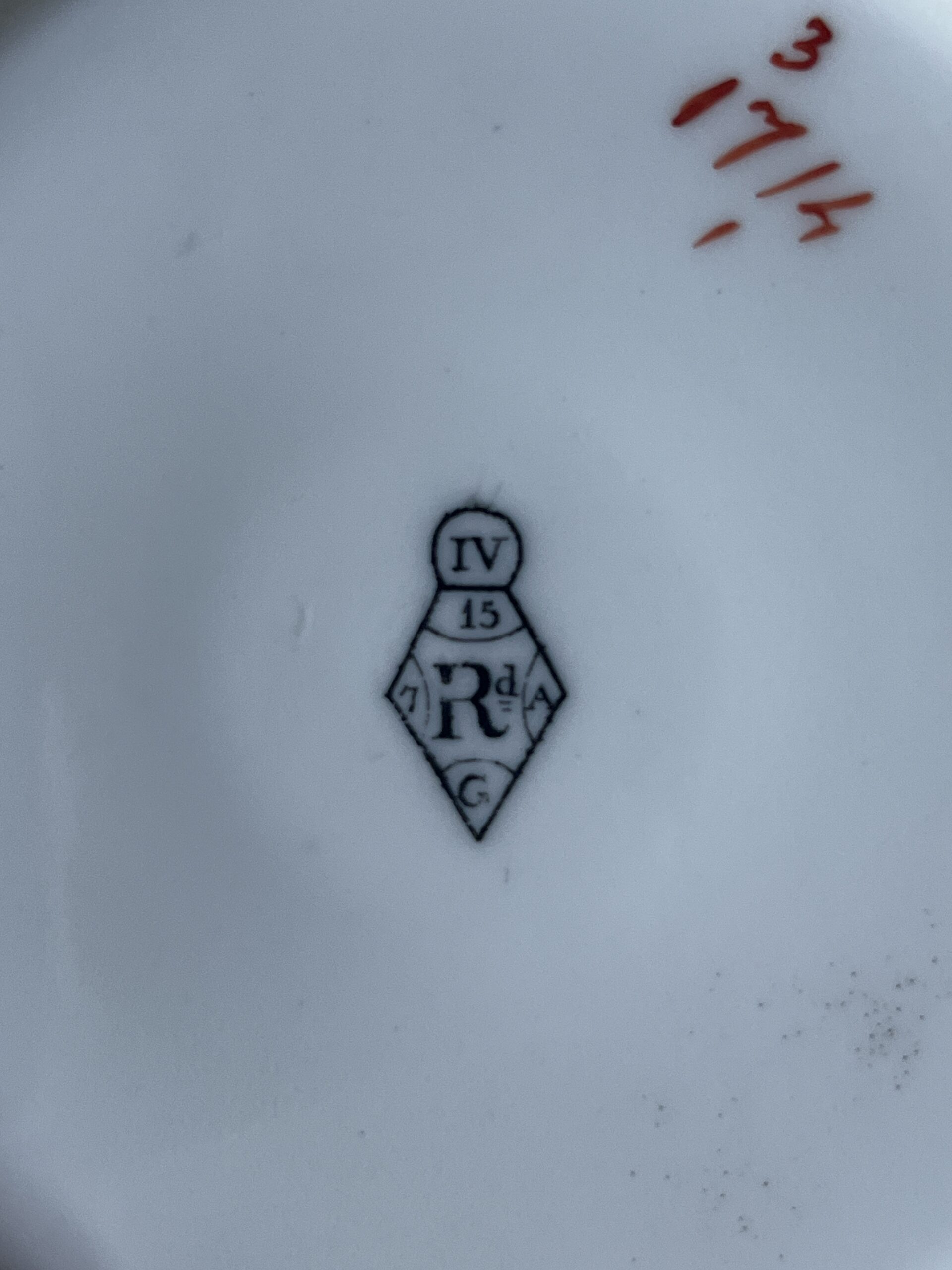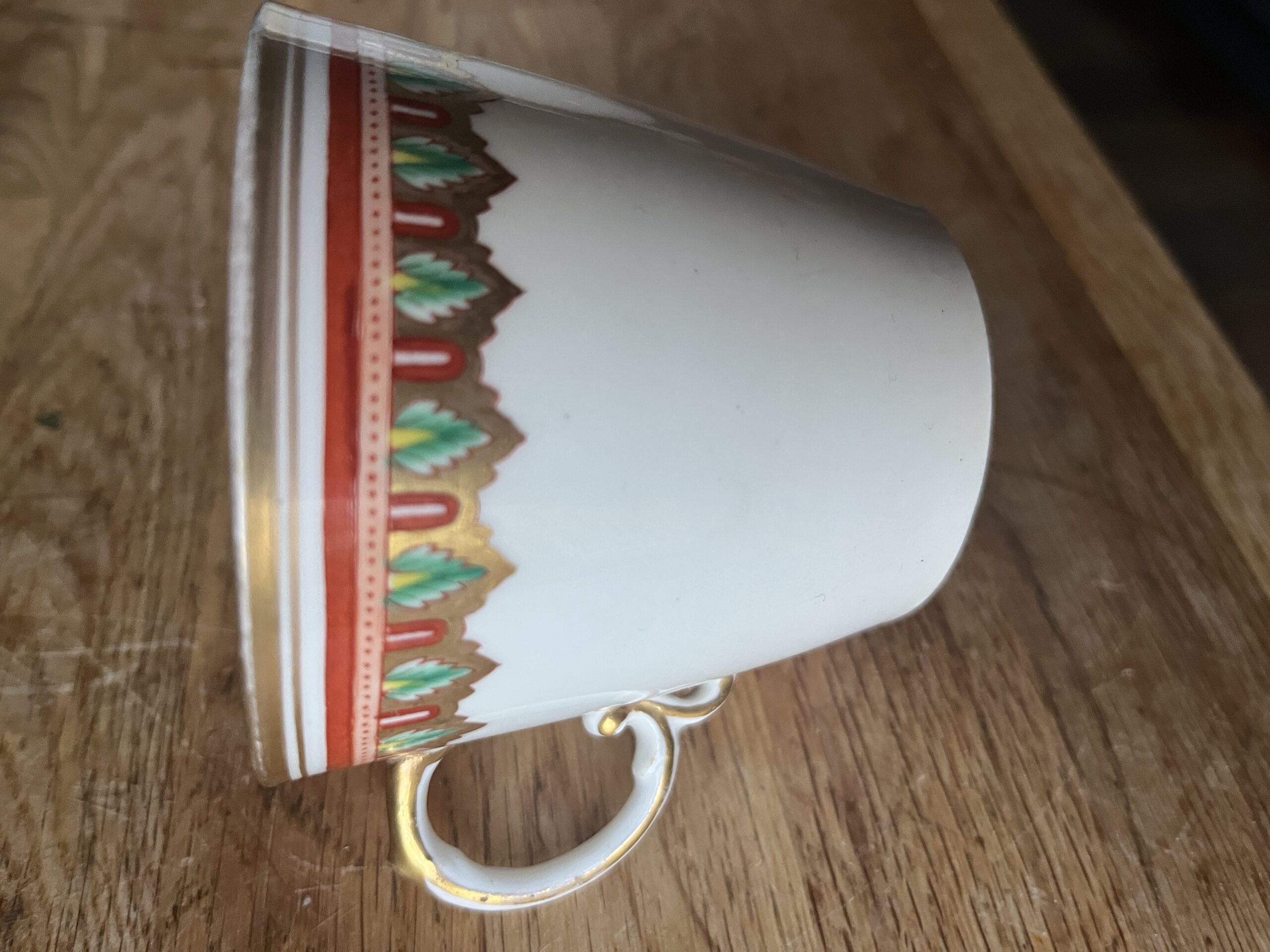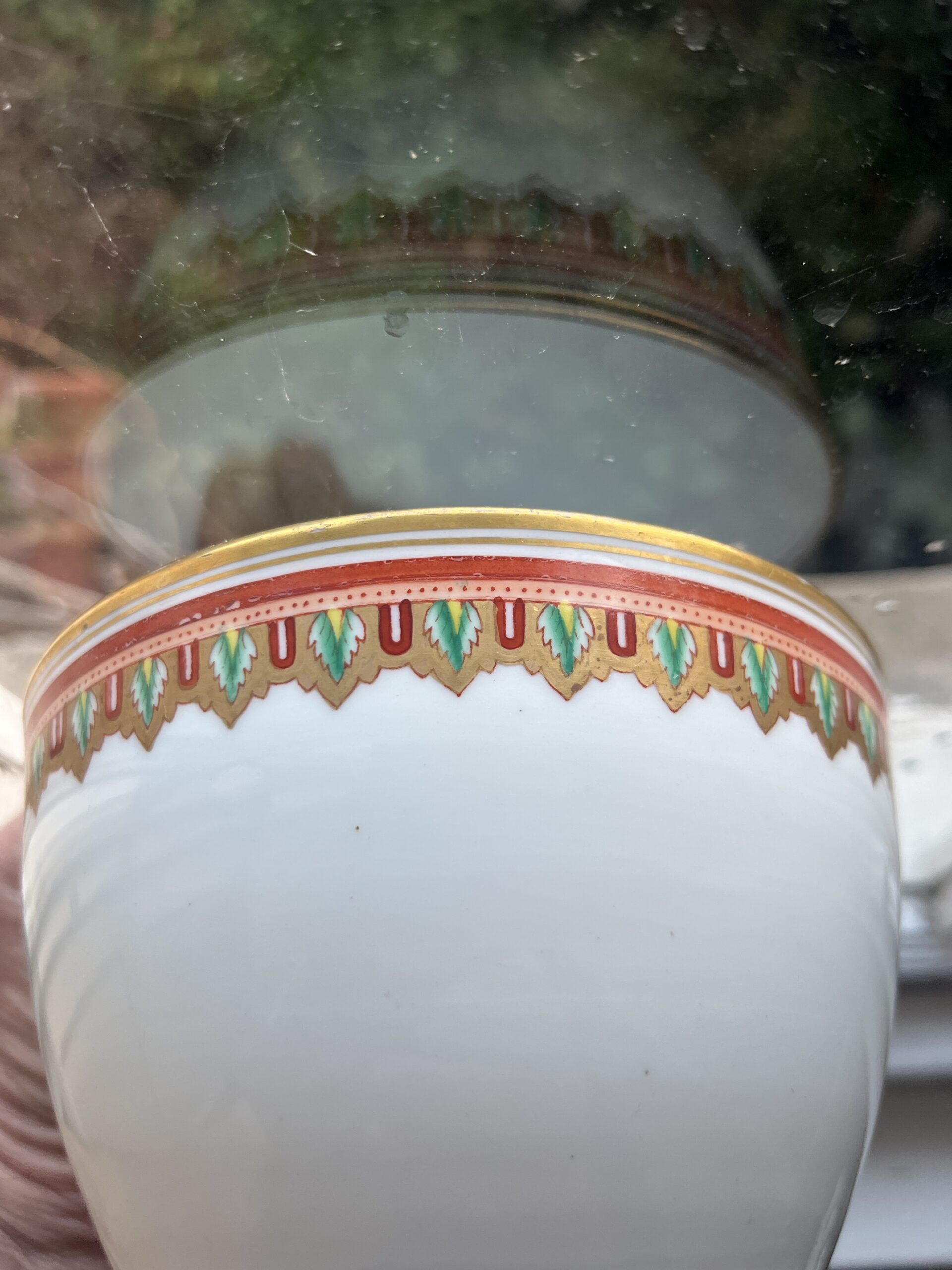 This one began with a breakfast set. Or rather, a partial breakfast set. A handful of cups, rather a lot of plates and saucers, a jug, a sugar bowl, egg cups, a couple of covered dishes. White porcelain, confident shapes, and a bold border: iron red, turquoise-green leaves, and thick gilding. It looked Victorian. It looked serious. It also looked like something that might send you down the wrong path if you weren’t careful.